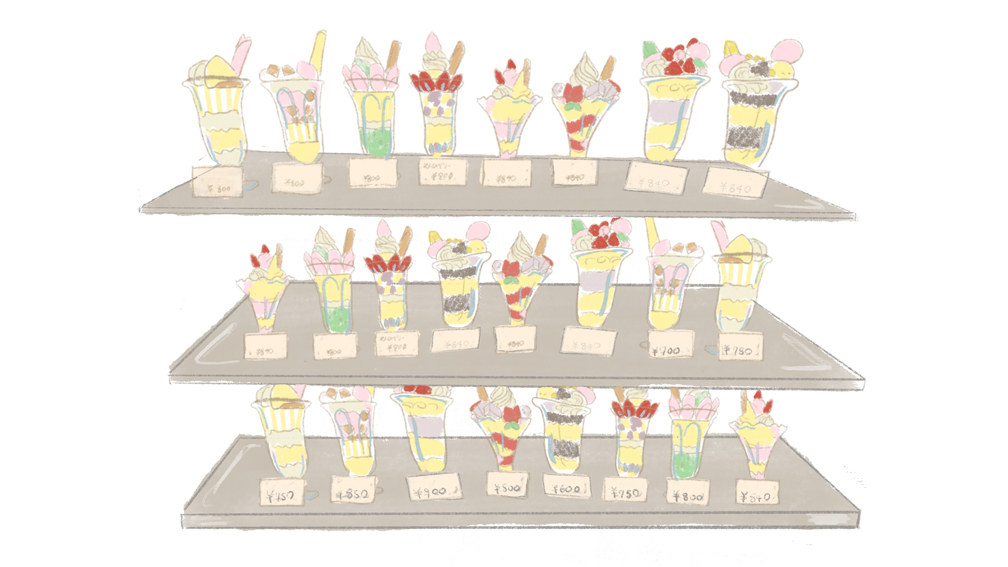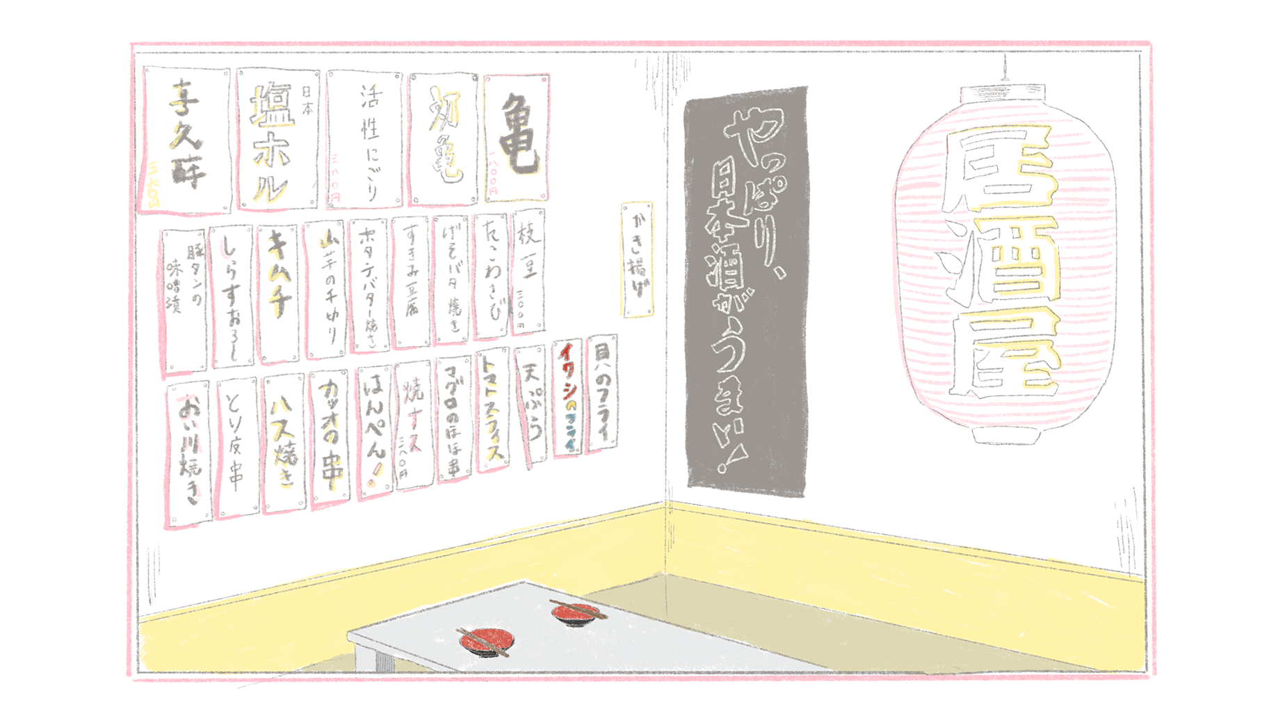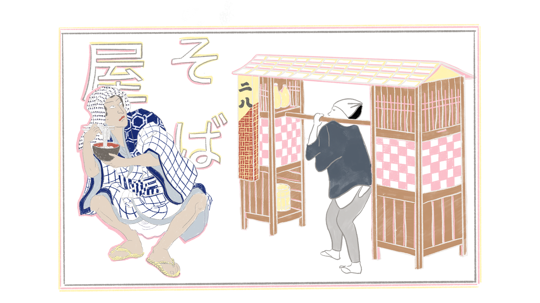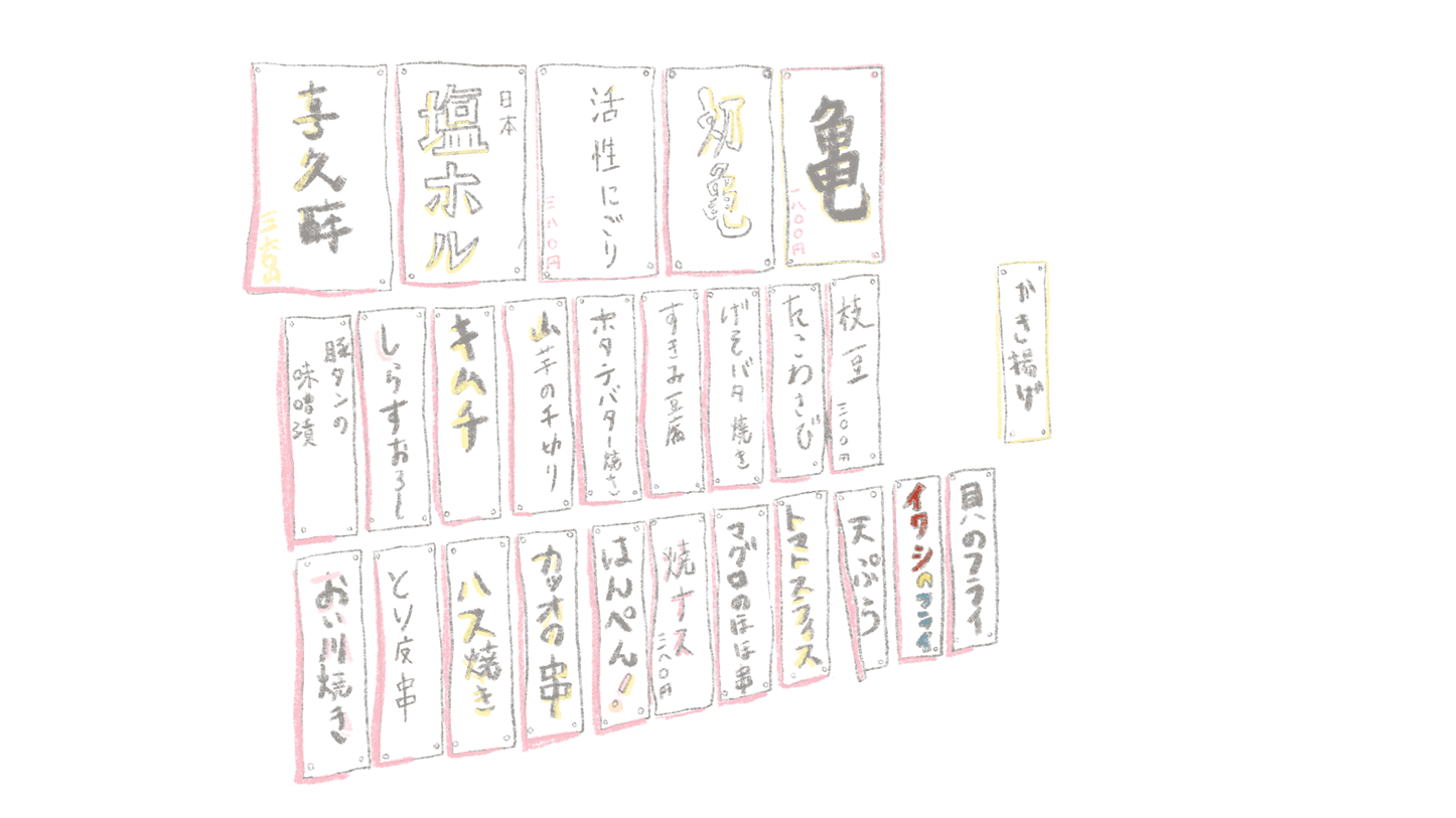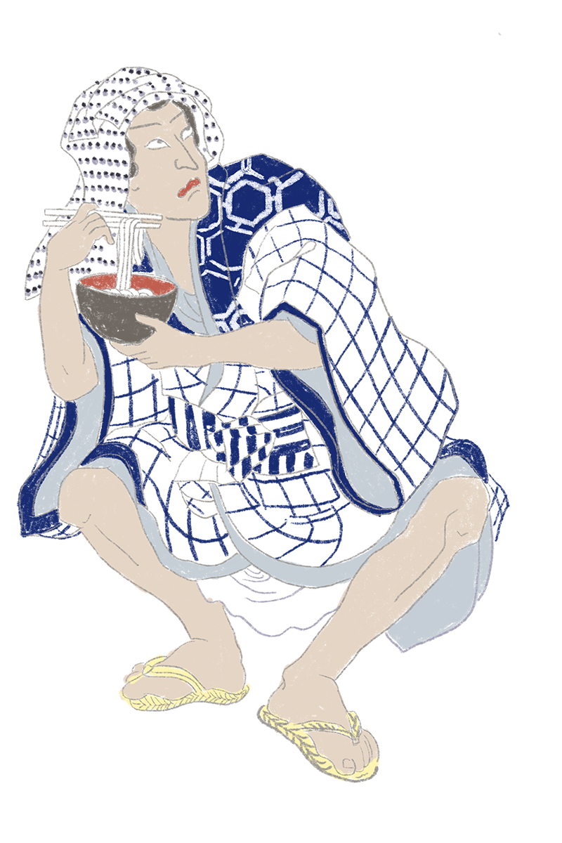 Yatai often had simple signs denoting what was on offer. Sushi, tempura, eel, and soba were popular, and a stall sign or paper lantern might simply say sushi, soba, or, more cryptically, 二八 (“2-8”) in kanji, which stood for soba, since the optimum ratio of wheat flour to soba flour is 20-80. Eschewing written menus, vendors laid food out for the customer to see and choose, a function of the stalls' limited space. Peddlers would shout out their offerings to attract custom. Illustrations from the era show that, in addition to signboards outside, indoor restaurants had food options written on strips of paper or wooden boards – akin to those we see today.