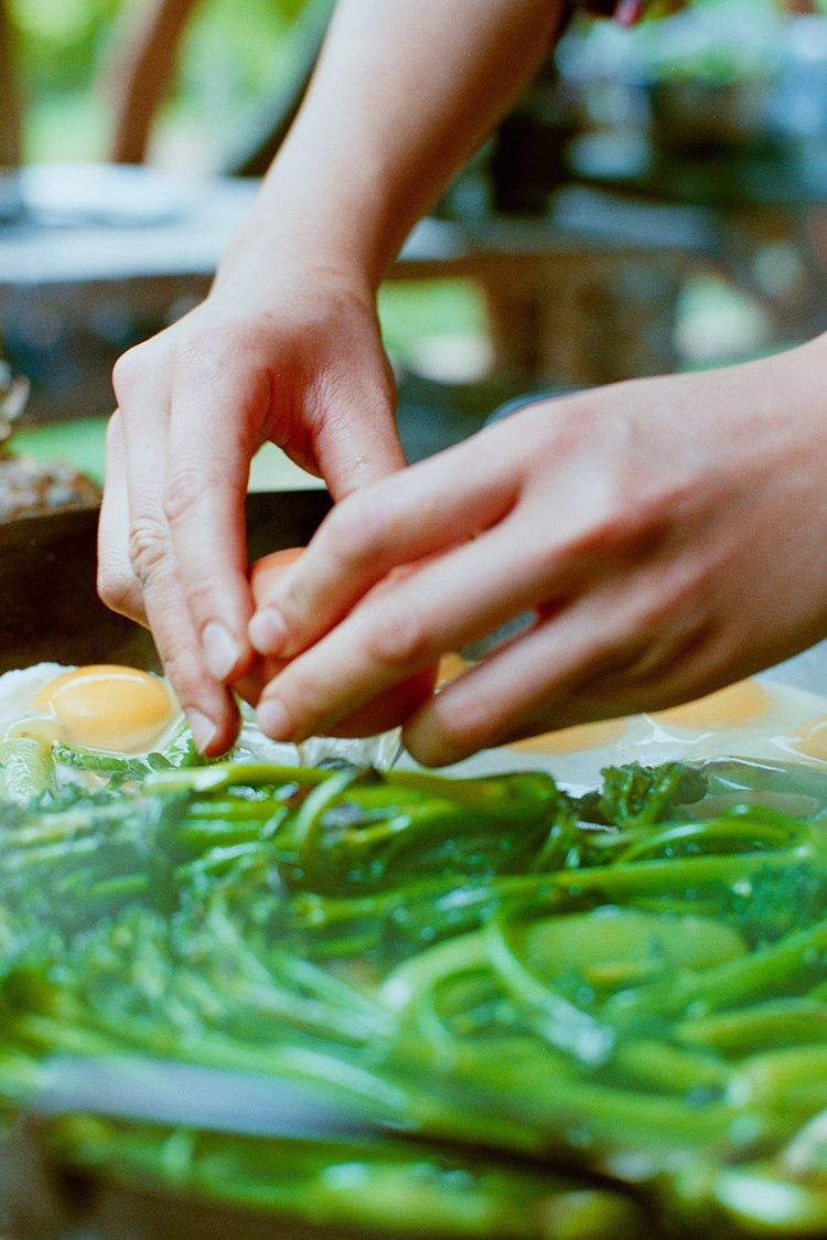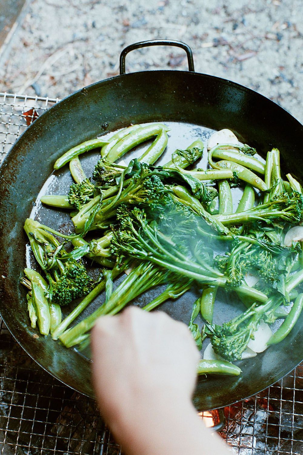 The morning after a night around a campfire in the woods of Nagano, I woke up in the morning and take a deep breath in the nature. I rekindled the fire and looked for what food was left. There were snap peas, turnip, broccolini, and eggs, the inspiration for this recipe. Super simple, the special spice is nature: an open-air meal, surrounded by trees and greens.