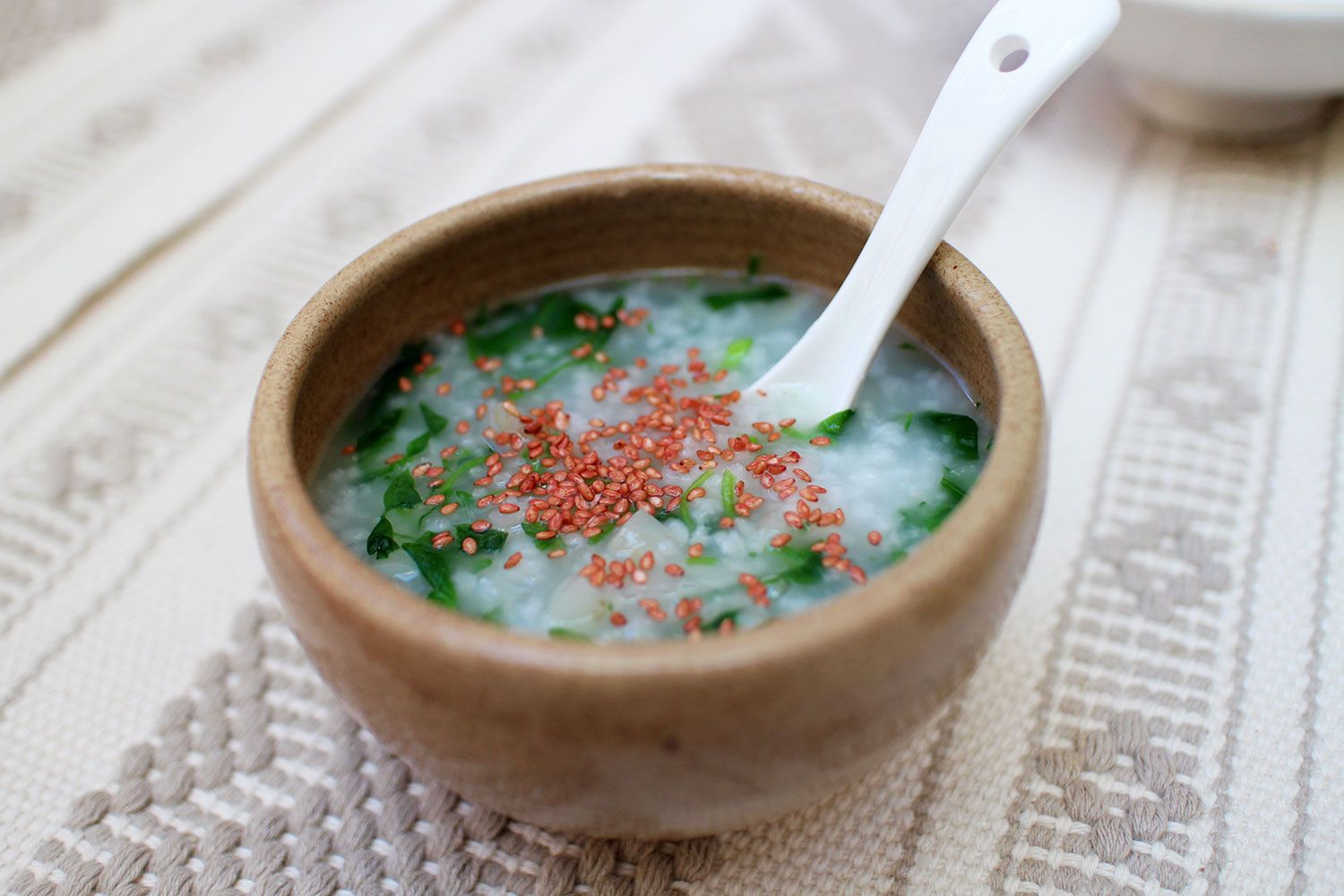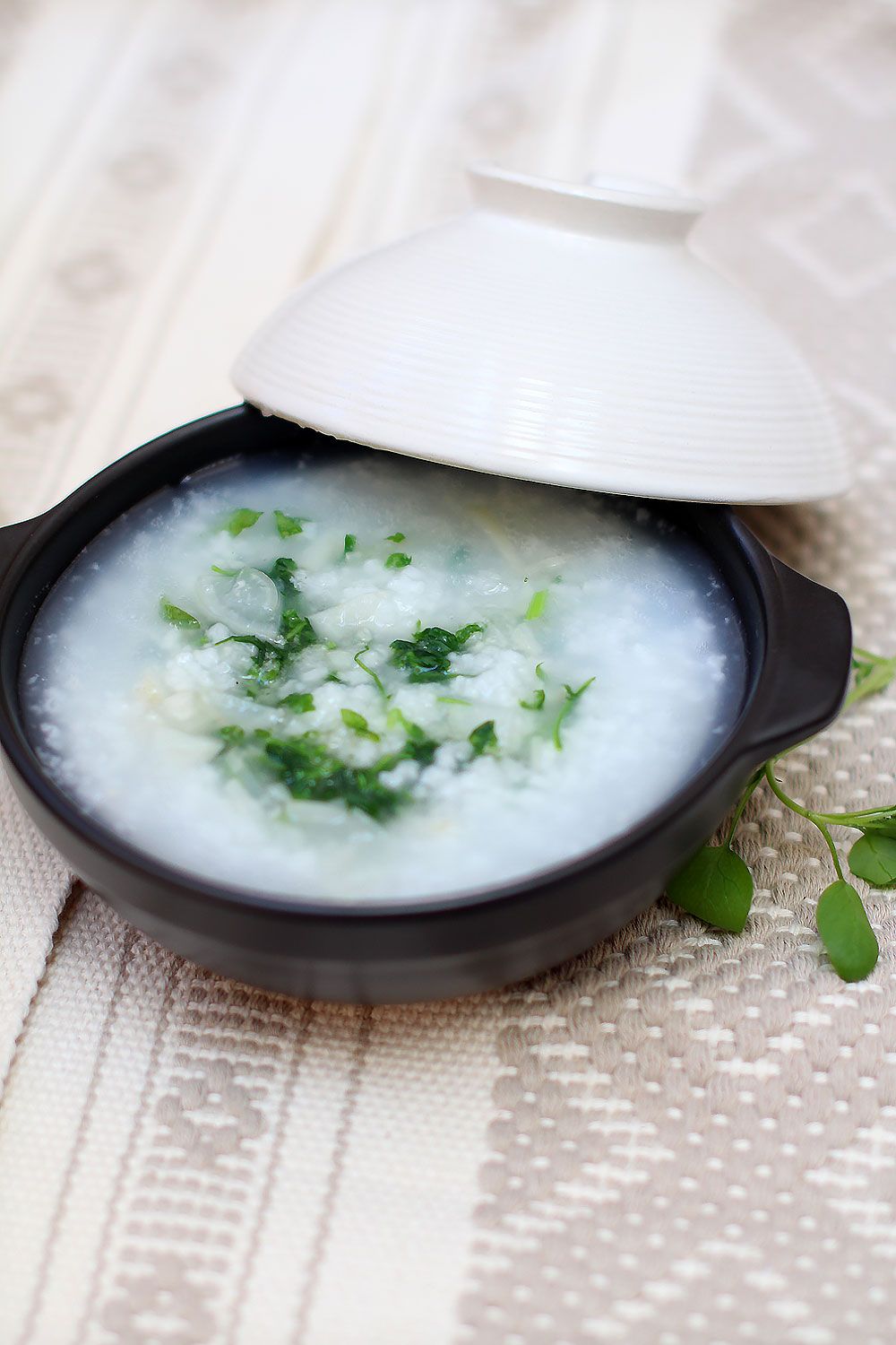 2. Place over medium-high heat and bring just to the boil, then reduce to the low for about 30 minutes, until the rice falls apart and the both becomes thick and soupy.