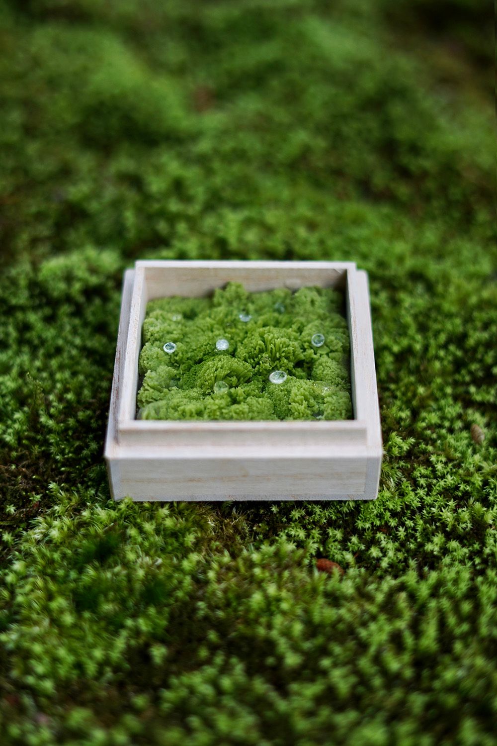 Moss is one of the most important components in a Japanese garden. It symbolizes the smallness of a human being in contrast to the greatness of nature and the flow of time, as it takes a long time for moss to cover an entire rock or ground. Grown moss teaches us the brevity of a human life. The sensual, soft surface, like a green fluffy carpet, also attracts many of us. This Japanese confectionery called kinton (chestnut and white bean puree) represents the Japanese moss garden with morning dew in a wooden box.