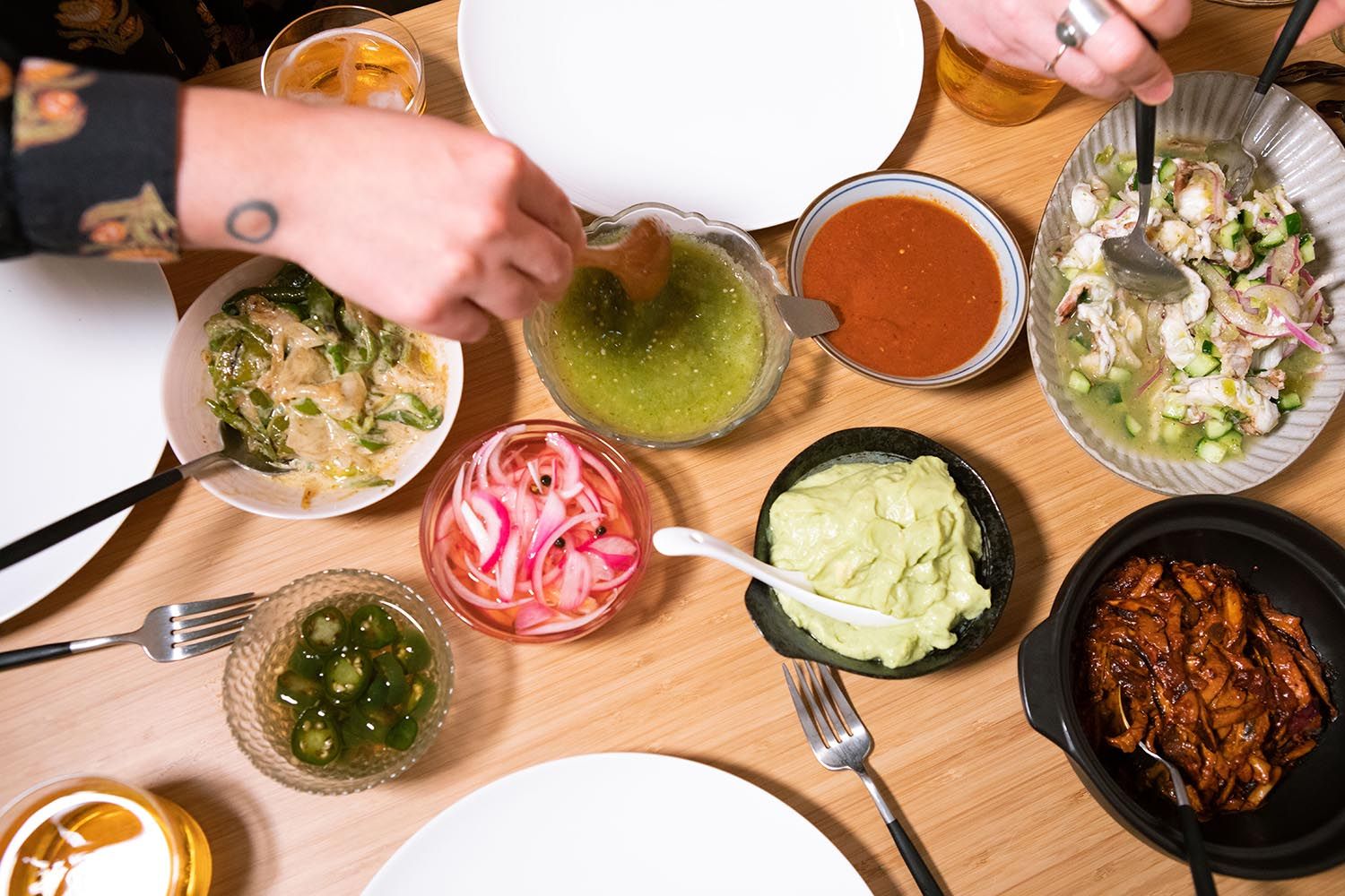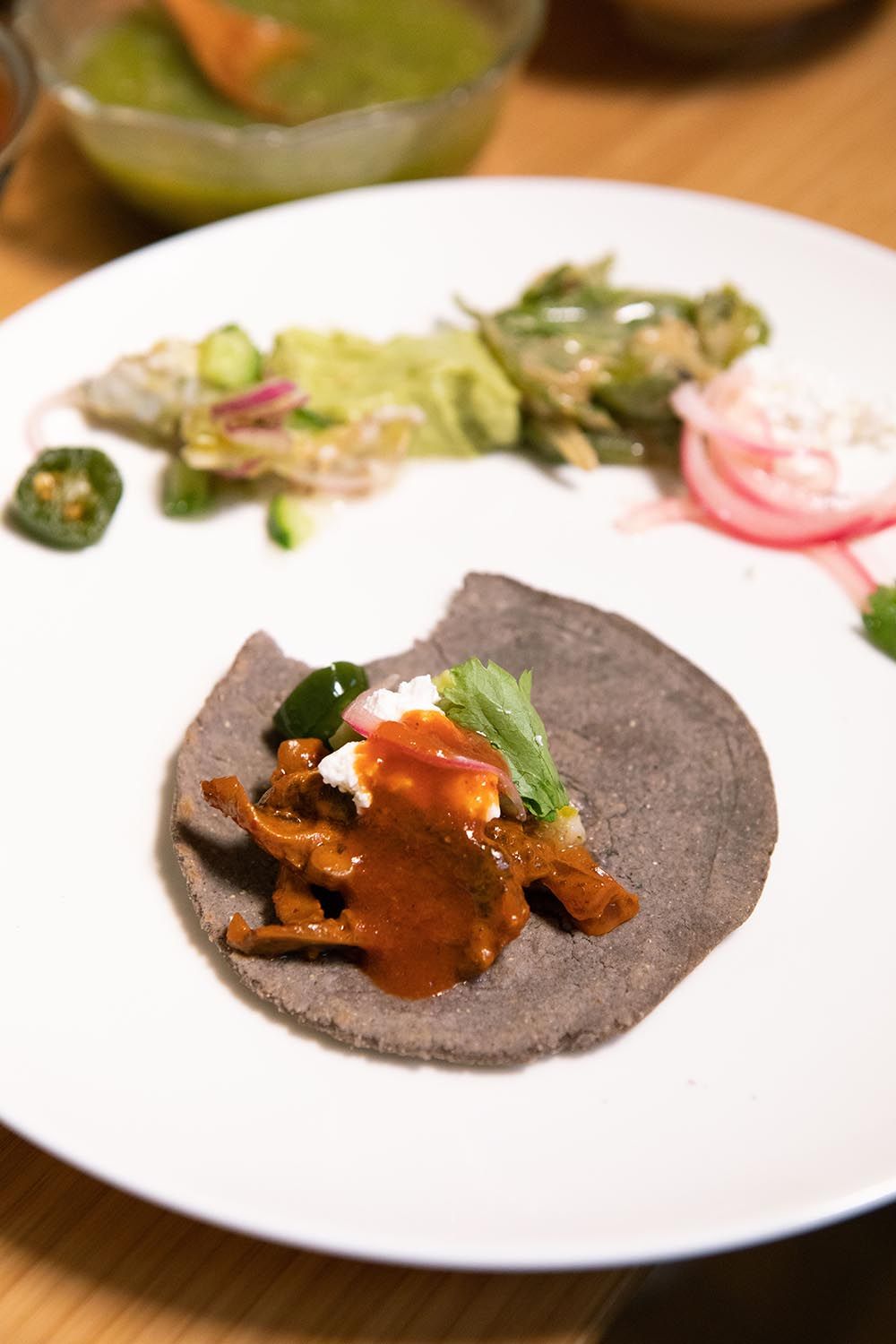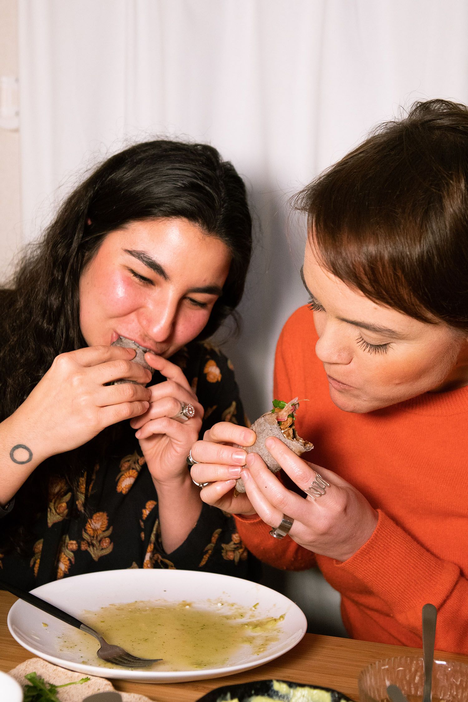 Jessie beams at her wife with full cheeks, as both hover over a shared plate to catch the juices from their palm-sized tacos. “Tortillas are deeply connected to Sofia’s roots and soul, so I feel eating them together brings us closer.”