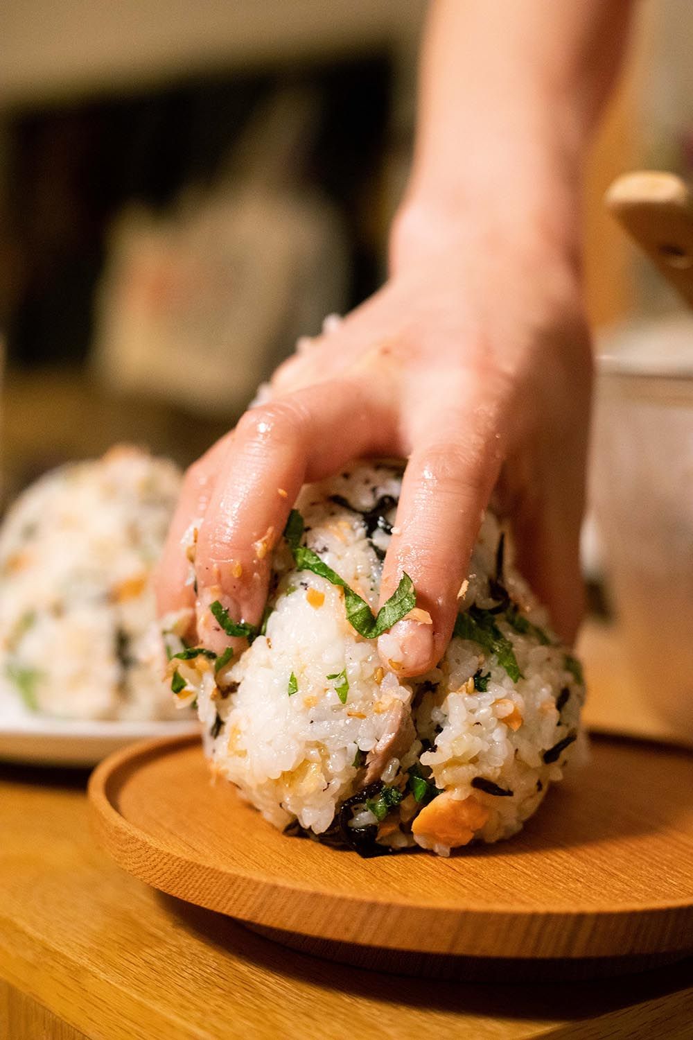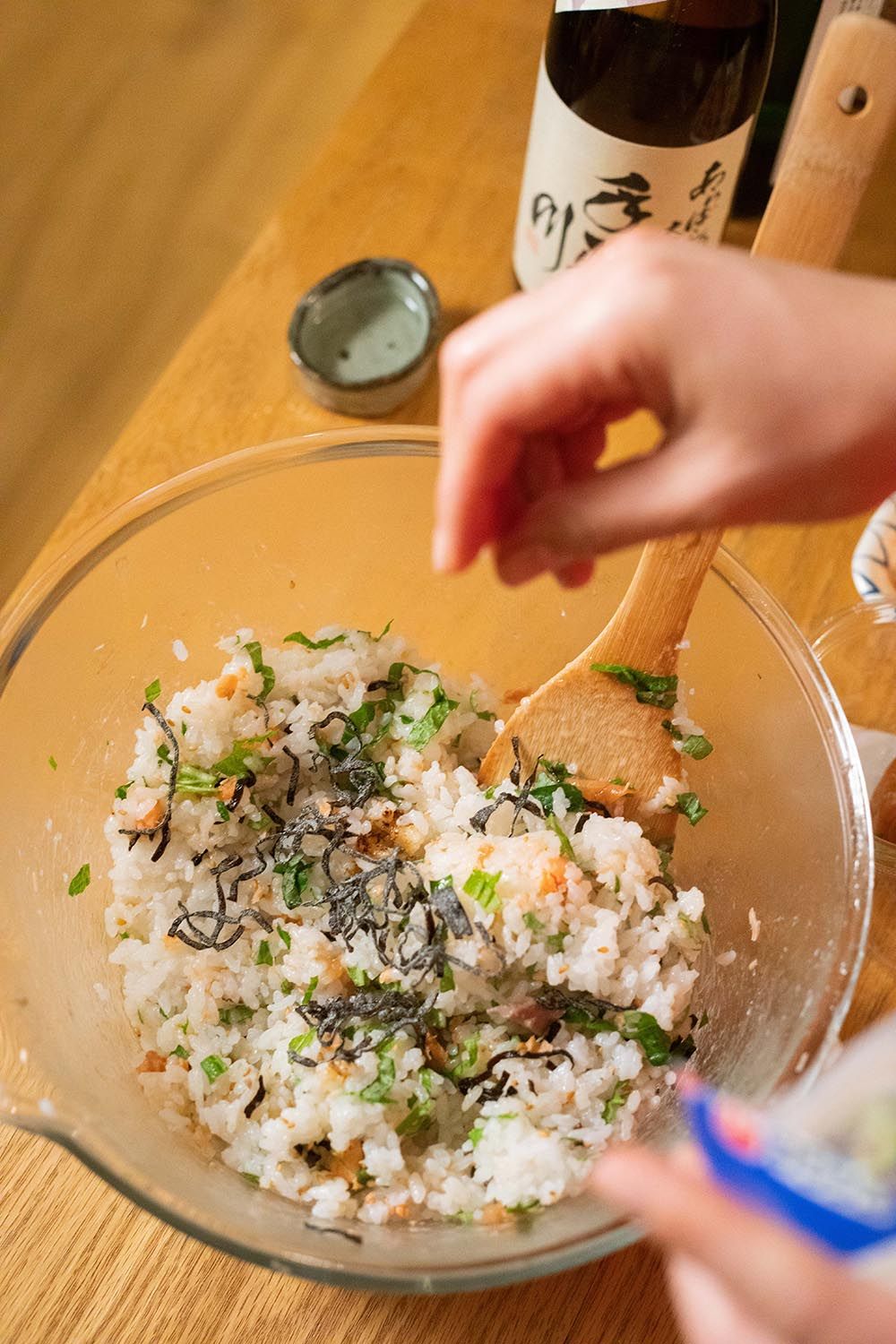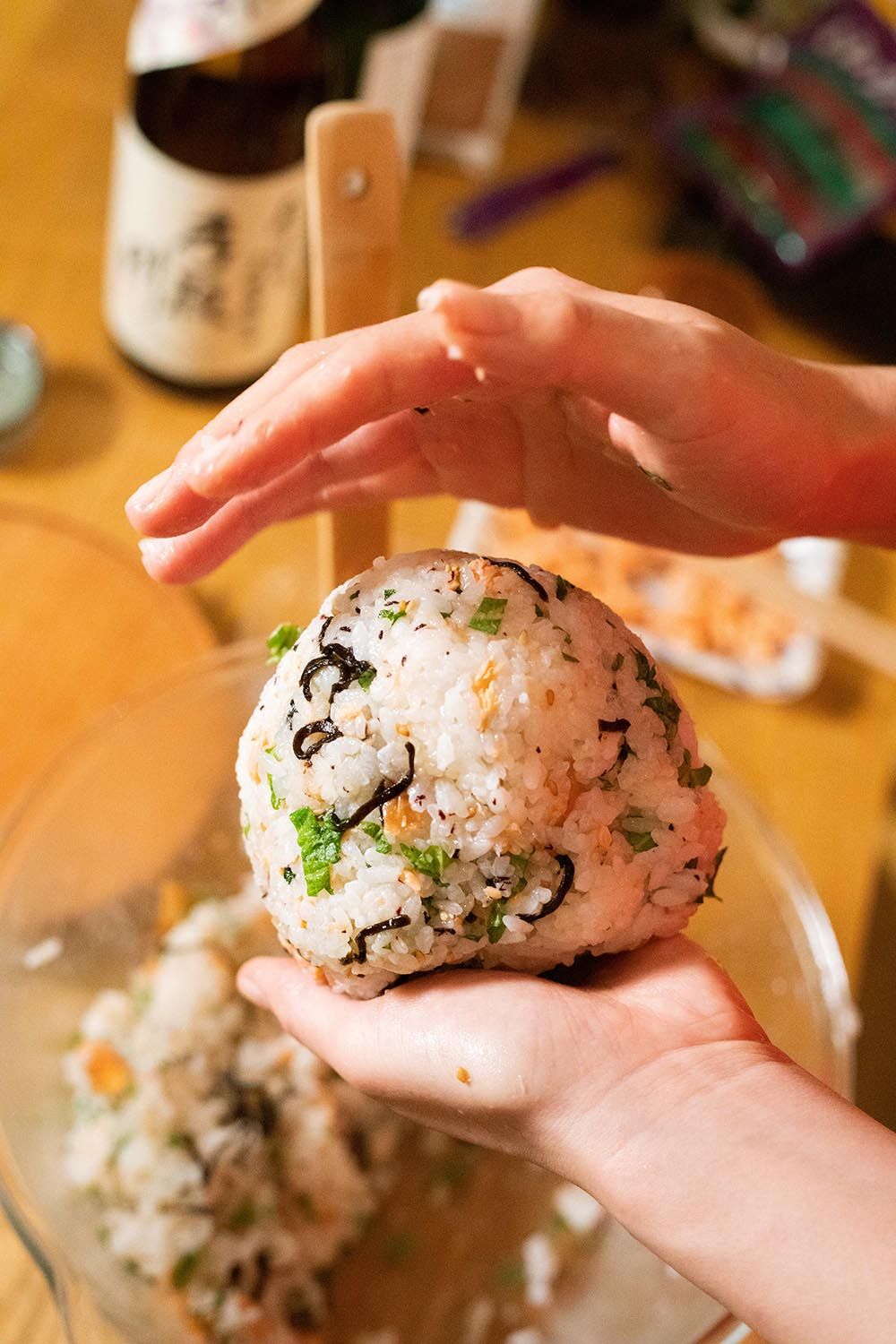 The two recently relived the experience while making the giant onigiri again in their Tokyo apartment. As they talked, Seira gently folded her fixings through an earthenware pot heavy with fluffy white rice – deep purple yukari (dry red shiso powder), bright green shiso leaves, shio kombu (dried, salted kelp), toasted sesame seeds, honey-soaked umeboshi (pickled plums) and flakes of shakke (salted and grilled salmon). Meanwhile Hiro, a sake sommelier, refreshed a trio of sake cups with a bottle from Seira’s hometown, Ishikawa Prefecture. I watched and listened as the homemade meal stirred memories of their first encounter – those rice balls that began their relationship and still fuel it today.