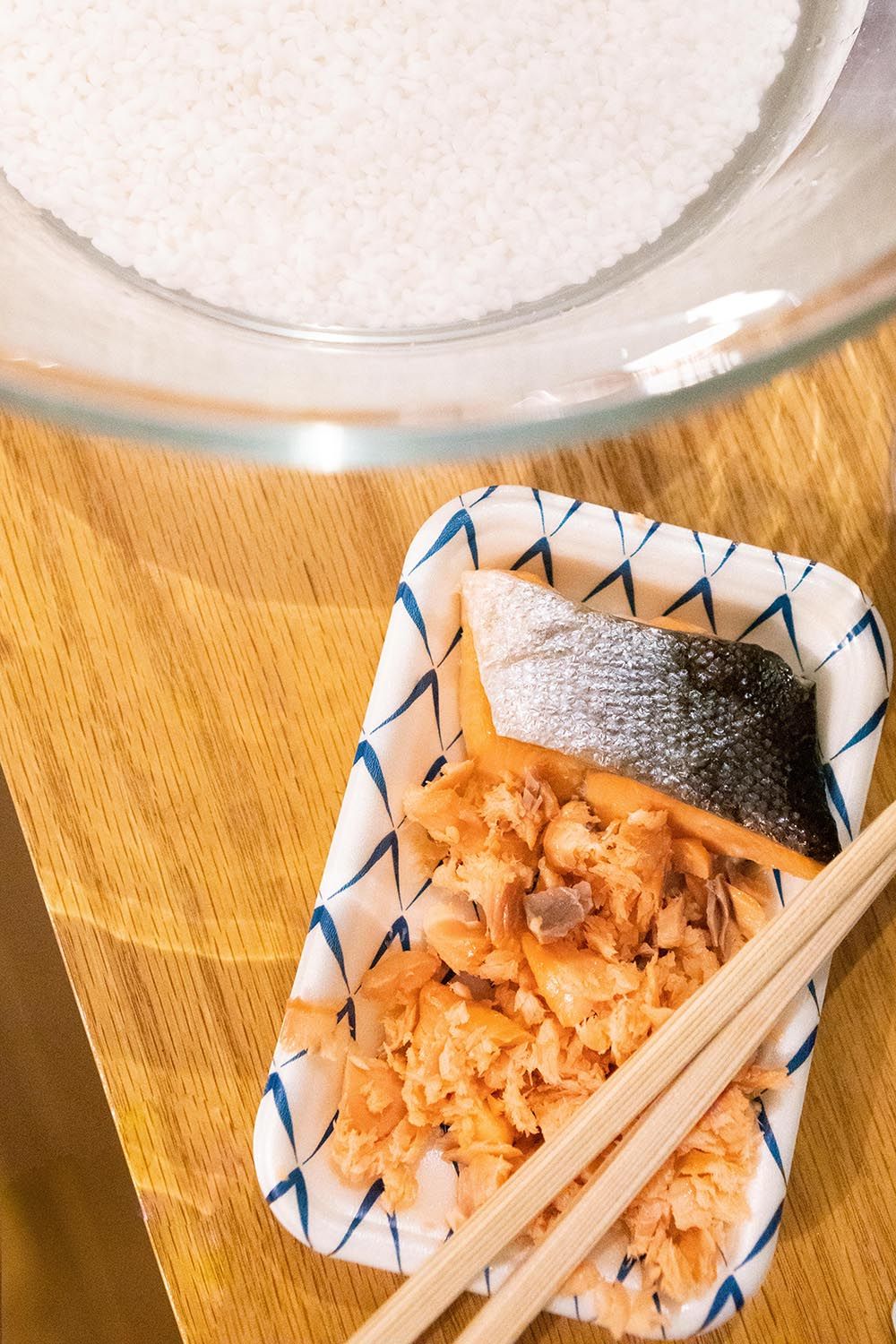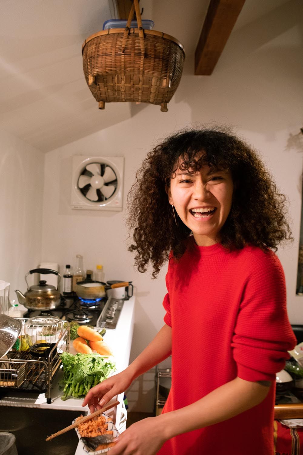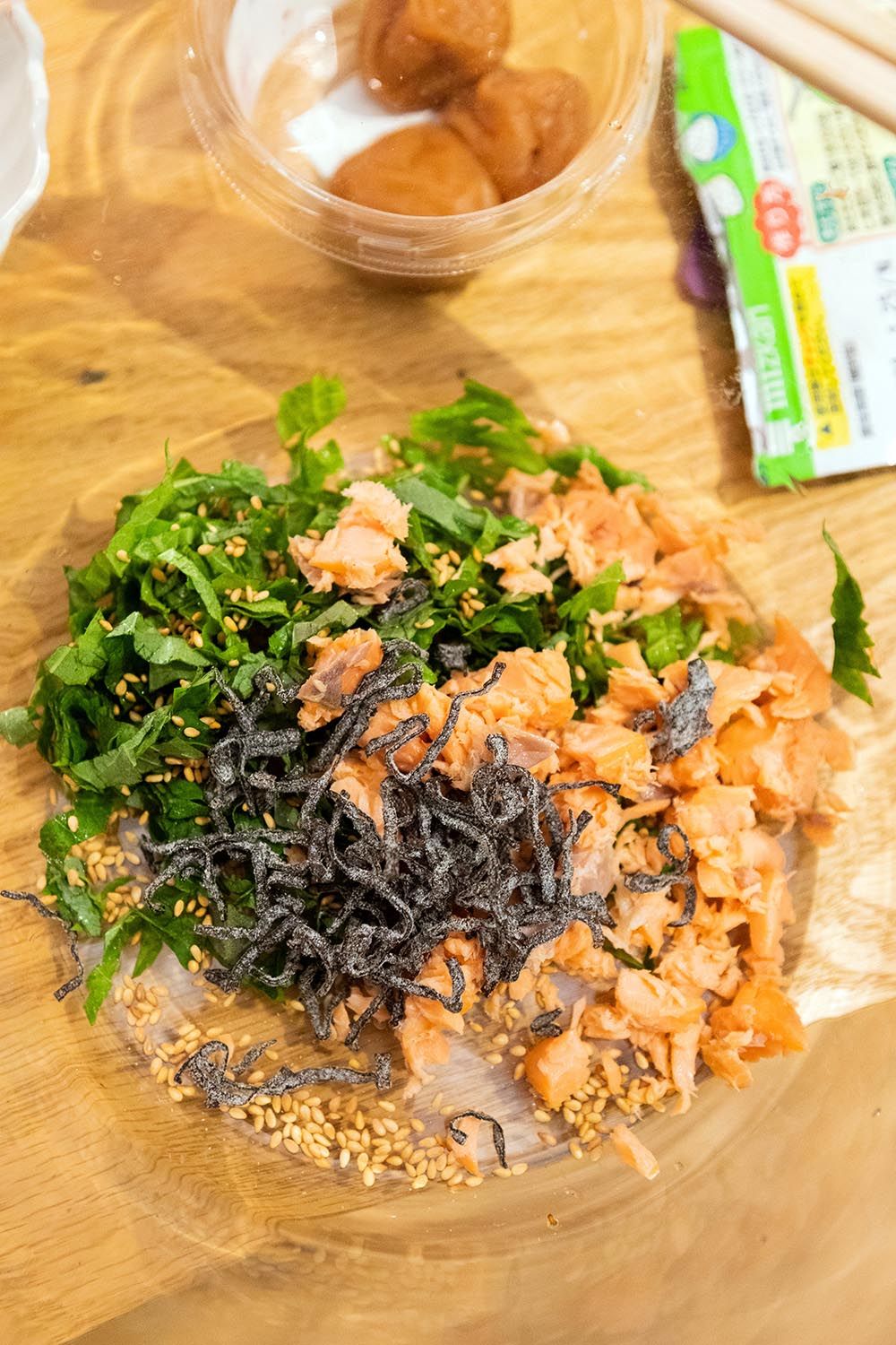 The two recently relived the experience while making the giant onigiri again in their Tokyo apartment. As they talked, Seira gently folded her fixings through an earthenware pot heavy with fluffy white rice – deep purple yukari (dry red shiso powder), bright green shiso leaves, shio kombu (dried, salted kelp), toasted sesame seeds, honey-soaked umeboshi (pickled plums) and flakes of shakke (salted and grilled salmon). Meanwhile Hiro, a sake sommelier, refreshed a trio of sake cups with a bottle from Seira’s hometown, Ishikawa Prefecture. I watched and listened as the homemade meal stirred memories of their first encounter – those rice balls that began their relationship and still fuel it today.