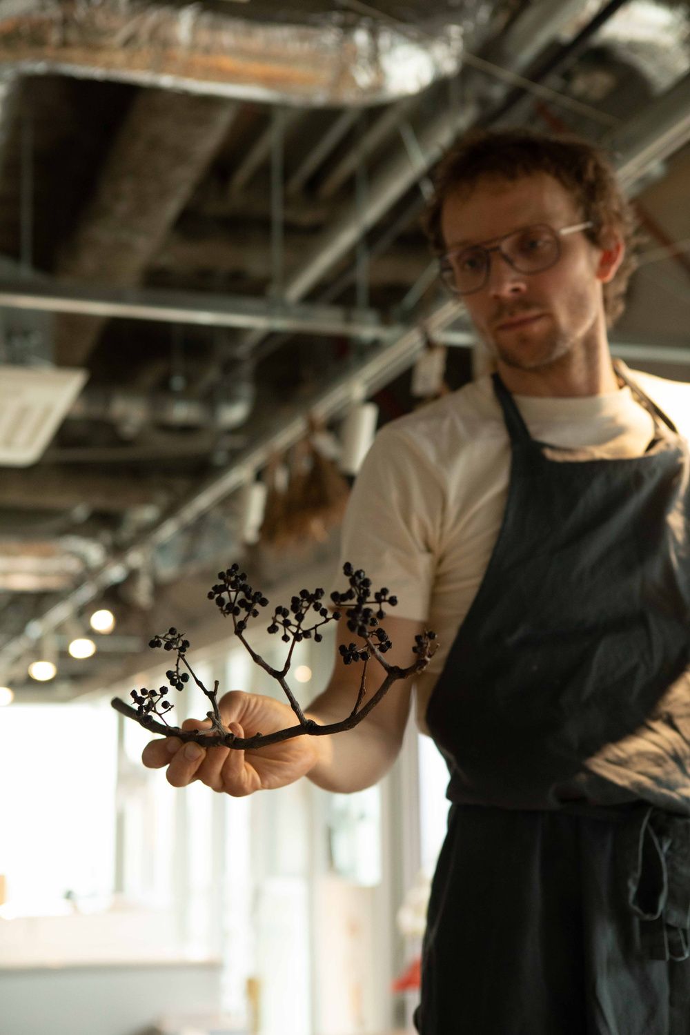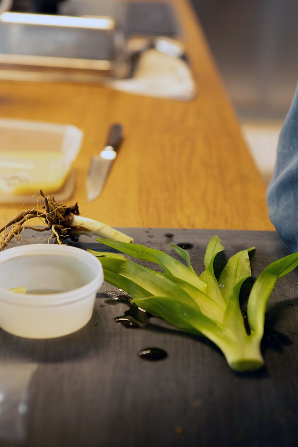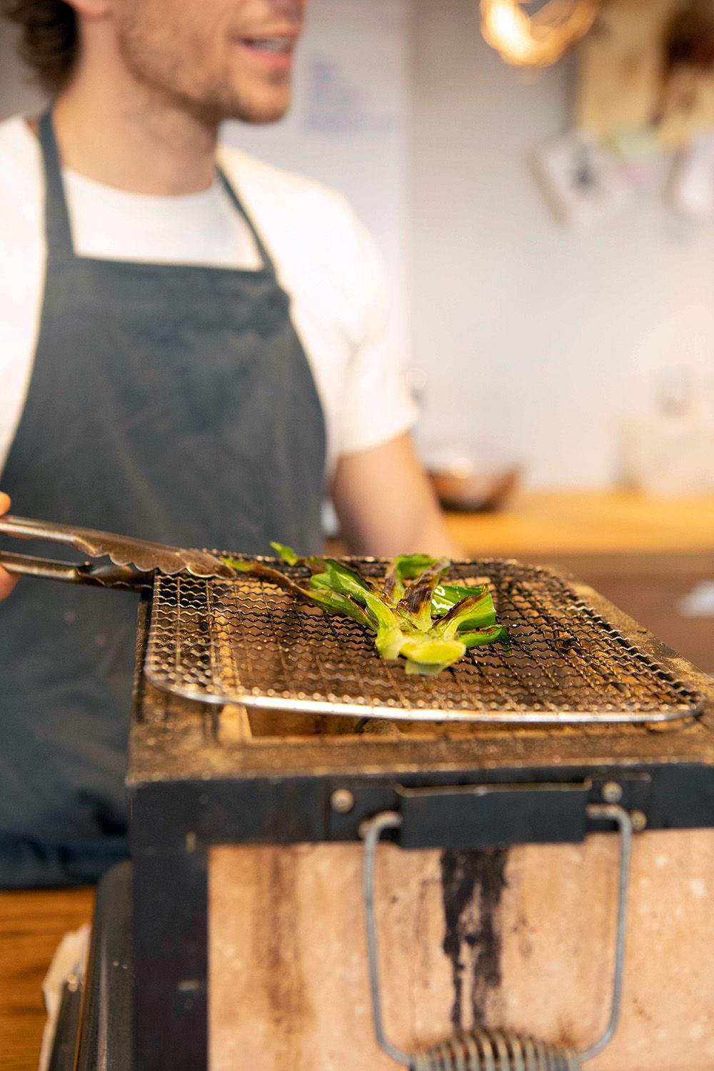 “It’s like a leek but not a leek, it’s better almost,” says Thomas, as he turns the vegetable – a stubby, pale green stalk topped with a bundle of dark leaves – on a countertop hibachi grill; the underside of it now slightly charred and giving off a sweet, onion-like smell. Once cooked, he brushes it with butter infused with pumpkin seed and green soybean tempeh.