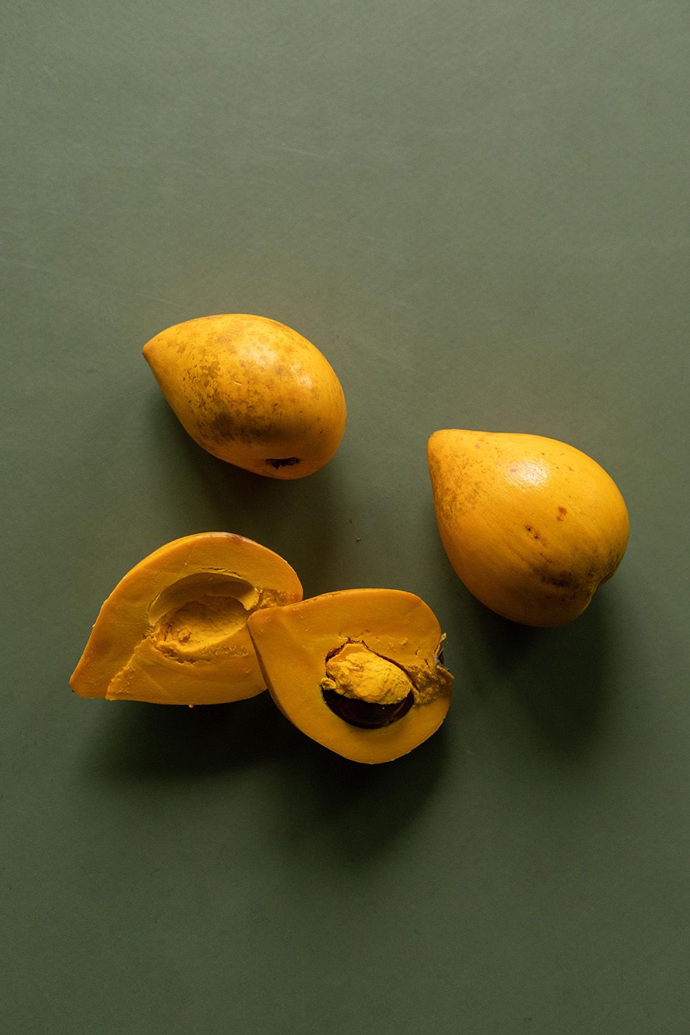 Canistel, or egg fruit, is a tropical fruit native to South America and cultivated in parts of Asia, including Okinawa. They have an unusual custard-like flesh, like the lovechild of a pumpkin and an avocado. “We discovered these two years ago, but we couldn’t figure out what to do with them. Now, I think we’ve found our way.”