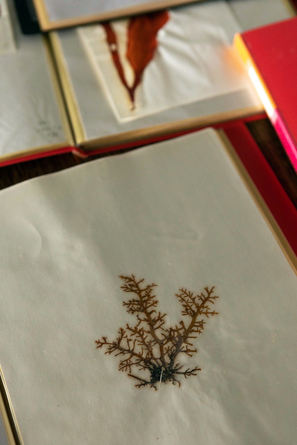 Thomas pulls out some large scrapbooks of seaweed, inside are pages of pressed algae of mesmeric patterns and colors, a sweeping catalogue of an underwater garden. “We need probably two days to go through all of them,” he says.