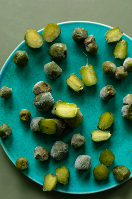 Bunches of kihada berries hang drying on their branches from the lofty banisters of Inua’s test kitchen, others are in stacked containers with other native ingredients.