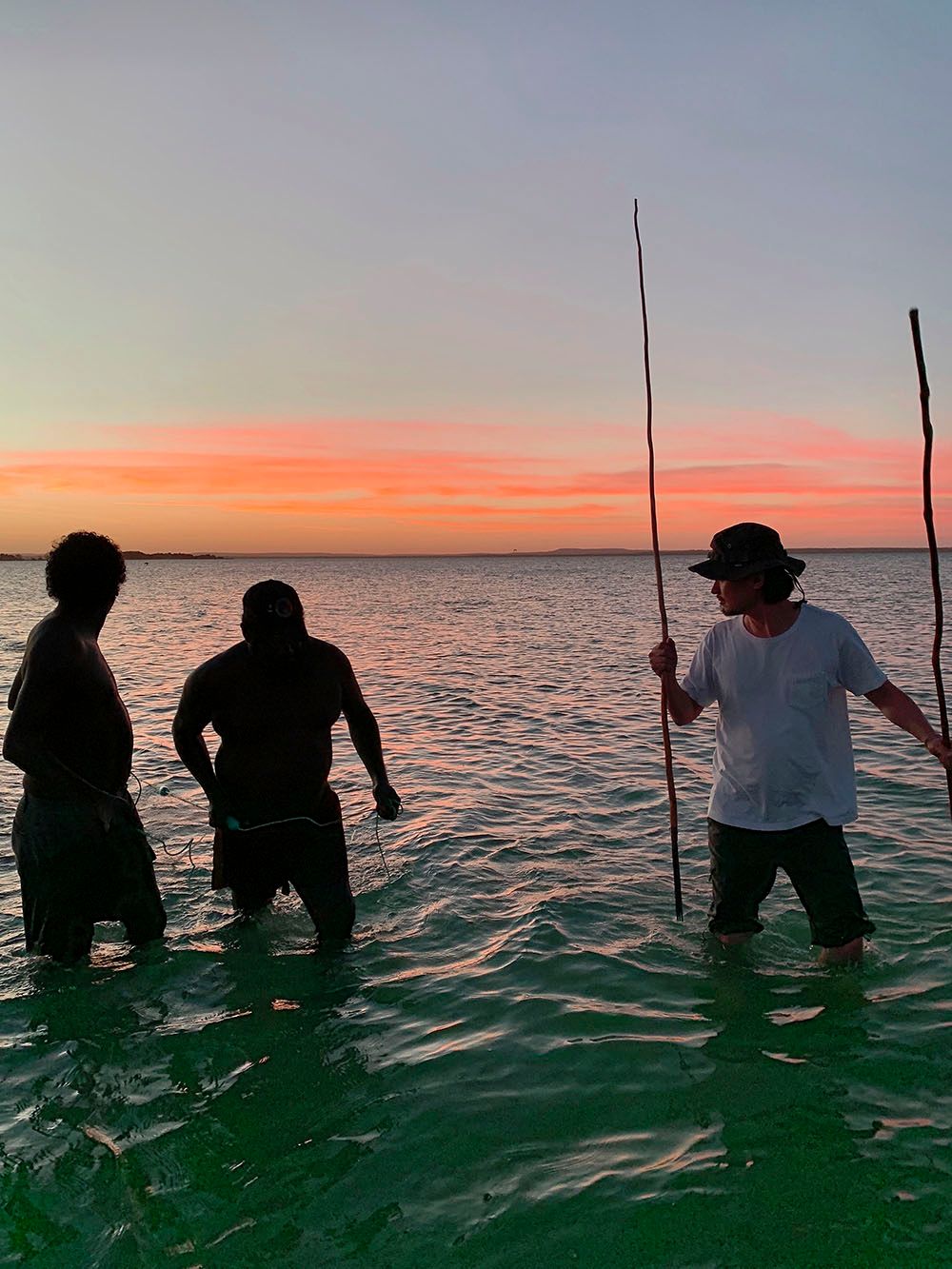 Soon after arriving, the brothers decided it was time to catch some dinner. We climbed into a four-wheel drive and headed for one of the beaches we had passed on the way. It was straight into the water with spears and a net, and I can still recall the looks on our faces – we knew these waters were teeming with saltwater crocodiles. But we trusted our hosts and, within minutes, had a bulging catch of mullet.