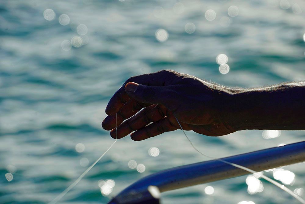 DAY 2 – We woke early and, after a quick breakfast, we were taken out on the boat with Rrawun. The water was an incredible emerald colour and teeming with life, including crocodiles and sharks. We landed a couple of barracuda and a sweet lip, although Rrawun was really after a turtle or a dugong.