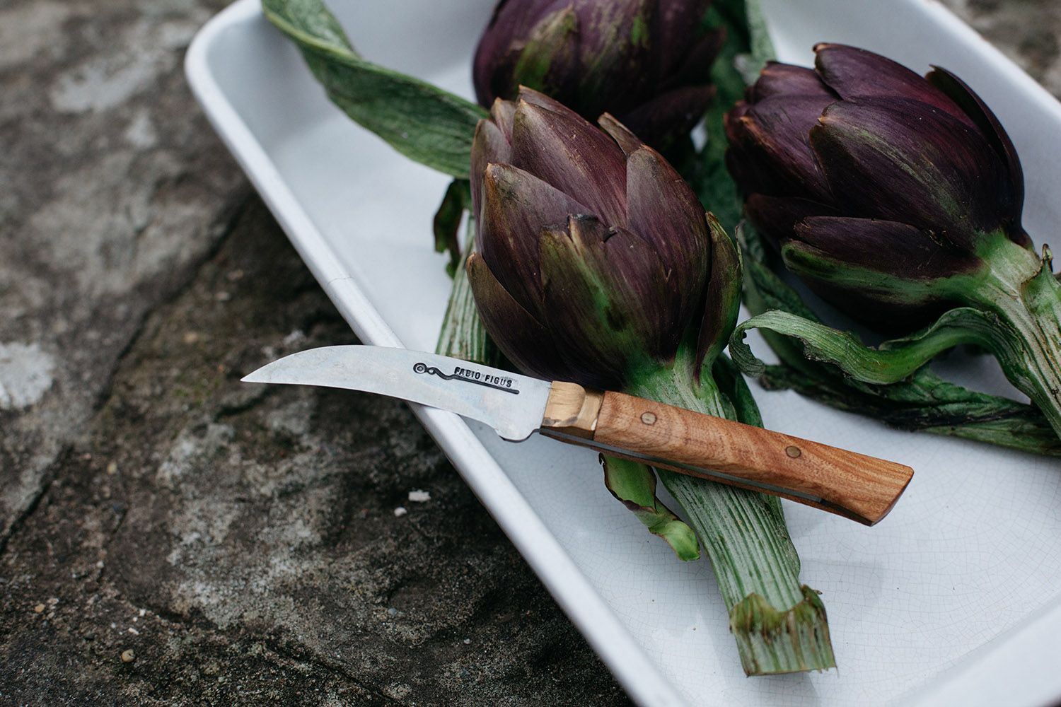 I have been collecting handmade knives from a young Florentine artisan, Fabio Figus, for a while now – they are my favorite, most essential kitchen utensils. For my birthday last year, my husband Marco bought me a whole knife set made by Fabio, complete with a leather knife roll. The handles are made out of walnut wood with brass details, classic and vintage-looking, but incredibly sharp. Amongst the collection is a small knife with a curved blade that Marco asked Fabio to make specially for the set – it is for precisely trimming artichokes. That may sound like a very limited thing to do with such a beautiful handmade knife, but when you eat as many artichokes as we do – all winter and all spring long, raw in salad, braised, stuffed, deep-fried or chopped into a pasta sauce or frittata – it's certainly well used.