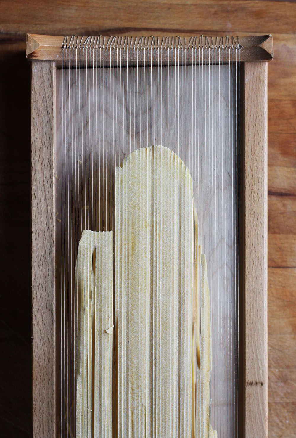 My guitar-playing husband has a soft spot for the chitarra, a rather large, wooden pasta-making instrument. It's named after a guitar for its many wire 'strings' that cut perfect, straight-edged Abruzzo-style spaghetti – often known as spaghetti alla chitarra – classically served with a hearty meat ragu. The long noodles are made from a dough of semolina and eggs that is first rolled out into a long, flat sheet, then rolled directly over the top of the chitarra frame. To remove the noodles, you 'strum' the strings like a musical instrument and they drop. They are similar to linguine or spaghetti, but with a square-shaped cross-section – like hand-cut soba noodles. In fact, I used to wonder if this pasta couldn't just be cut by hand like soba noodles, and I could save some space that the chitarra takes up in our very small kitchen. But the joy of using the chitarra like an instrument and the perfect, specific cut you get from it made me realize why these traditional tools are considered family heirlooms.