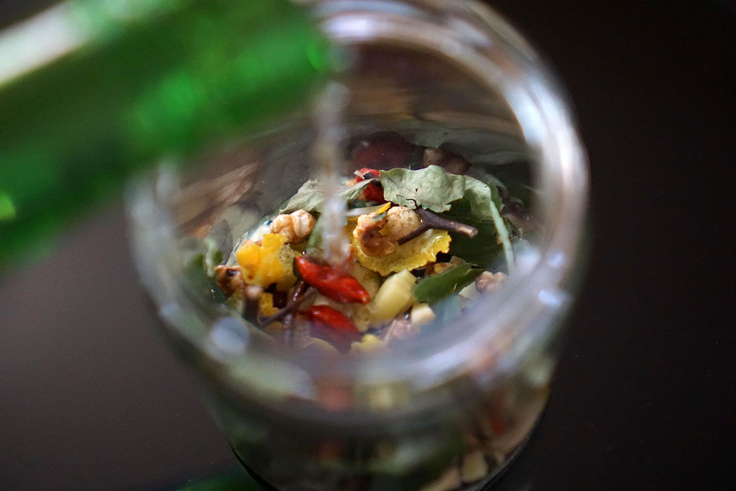 For the tososan, I selected materials that can be easily obtained at any home, so that you can feel tososan is more accessible and closer to you. Goji berries are often found in spice corners of supermarkets. Kuromoji can be replaced with any tea leaves you have at home.