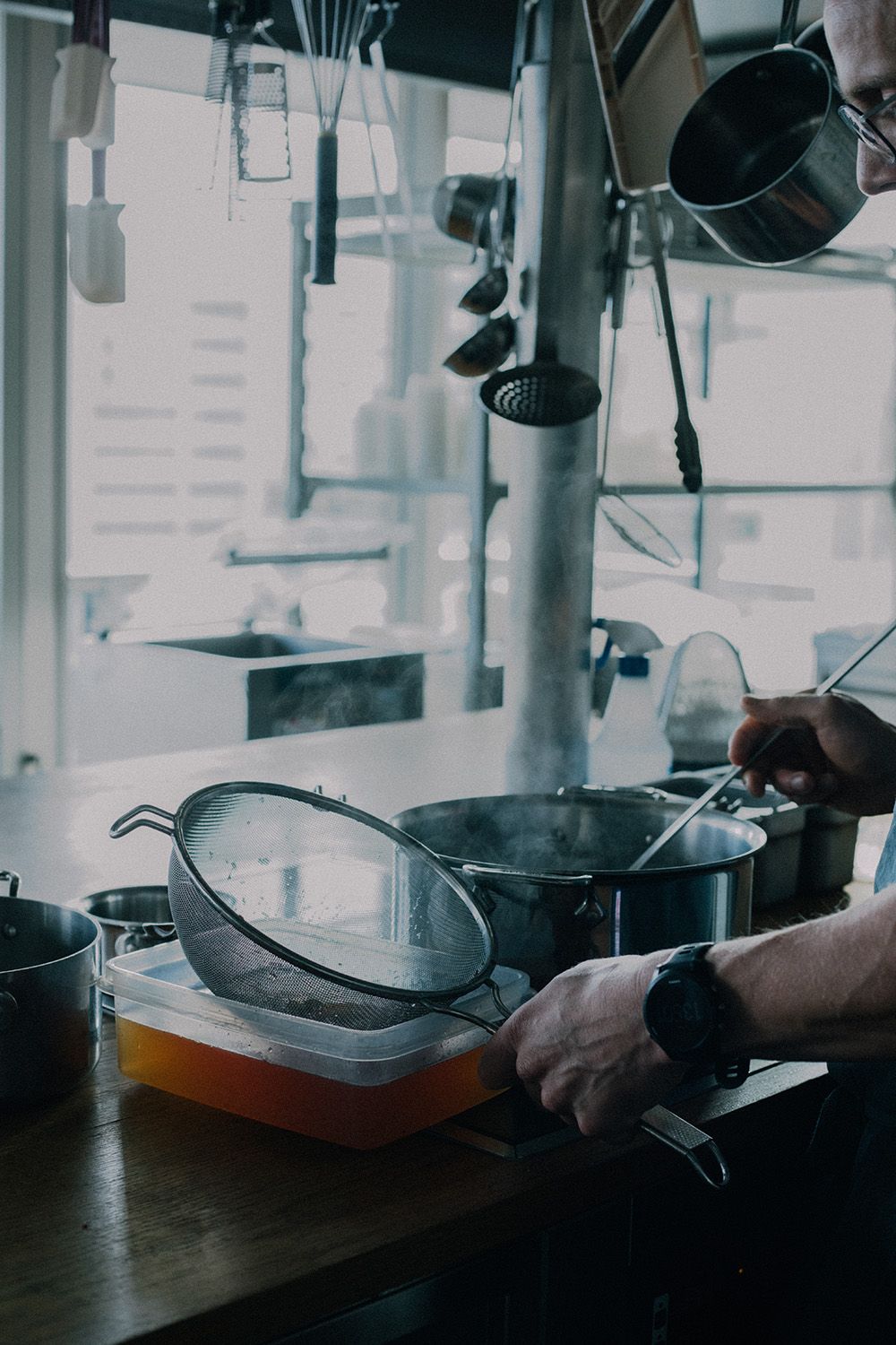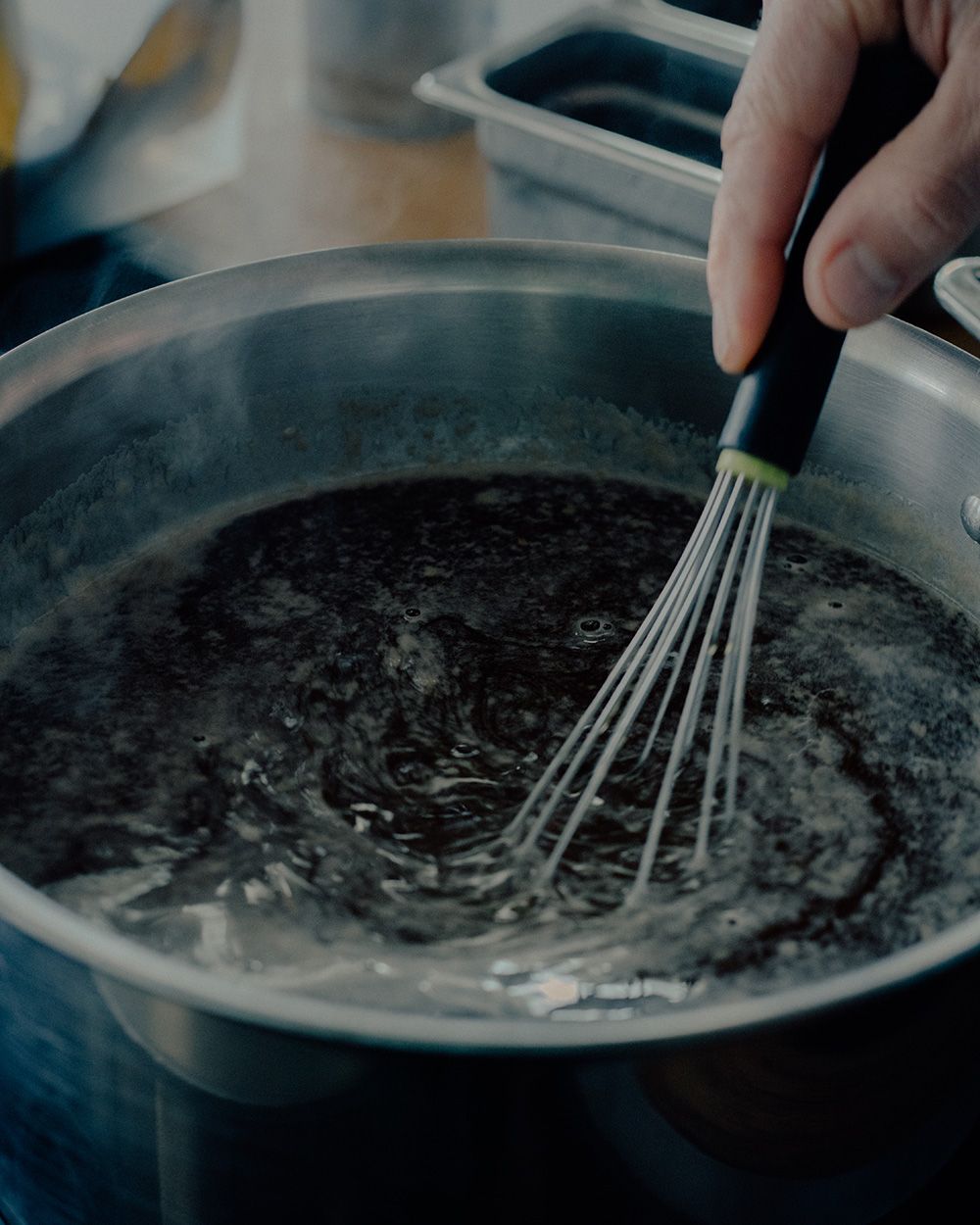 "In the restaurant we use cassis (blackcurrant) wood oil... this is quite nerdy, so for anyone cooking this at home, you can use your favorite sesame oil, favorite nut oil, a very light olive oil can work very well, too."