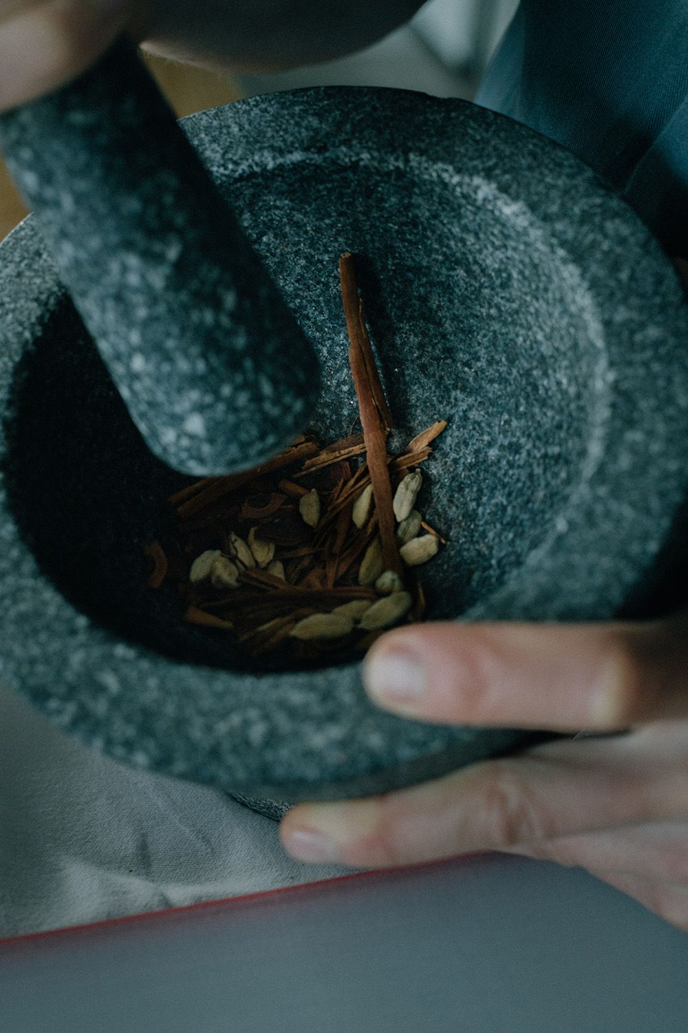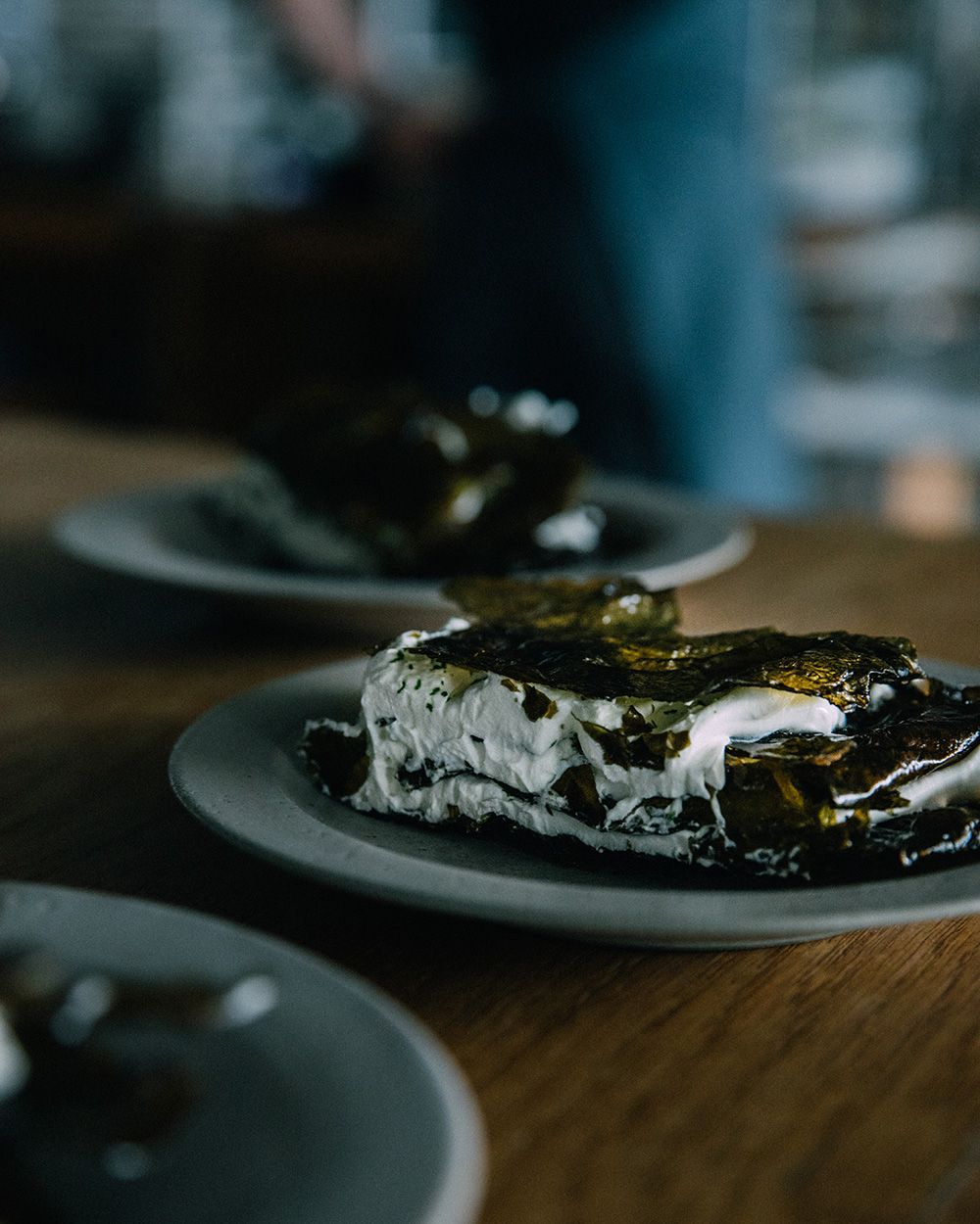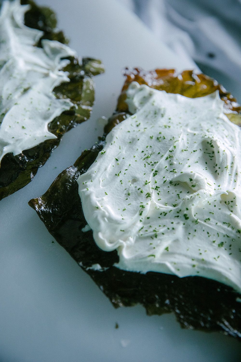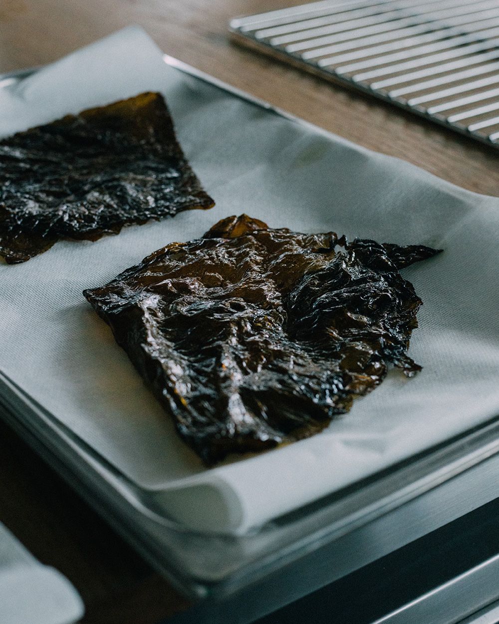 The seaweed is blanched in a spiced kombu dashi, then lacquered in ghee and icing sugar and baked until crisp. While it’s baking, it’s removed from the oven and folded for texture, “to create airy pockets characteristic of mille-feuille.”