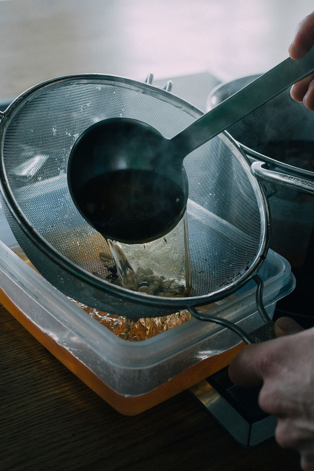 Submerge kombu in water and infuse in the refrigerator for 12 hours. Strain, keep the kombu for other applications.