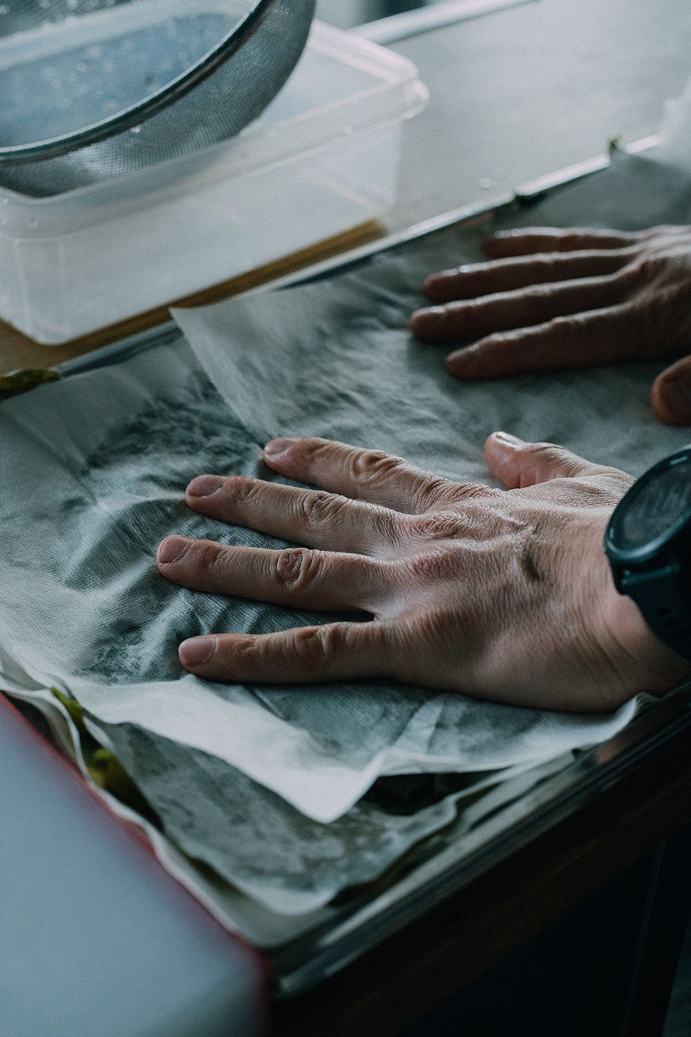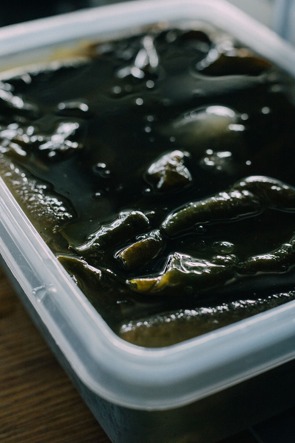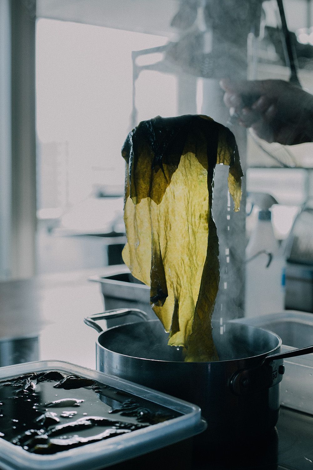 Trim away the main stem of the Hirome seaweed so all that is left is the thin “leaves” on either side. Wash a few time in plenty of fresh water to remove excess salinity. Blanch the trimmed seaweed in the sweetened dashi for 30 seconds, then refresh in the ice slurry. Once fully chilled, drain the seaweed well and lay flat on trays lined with paper towels to remove all excess moisture.
