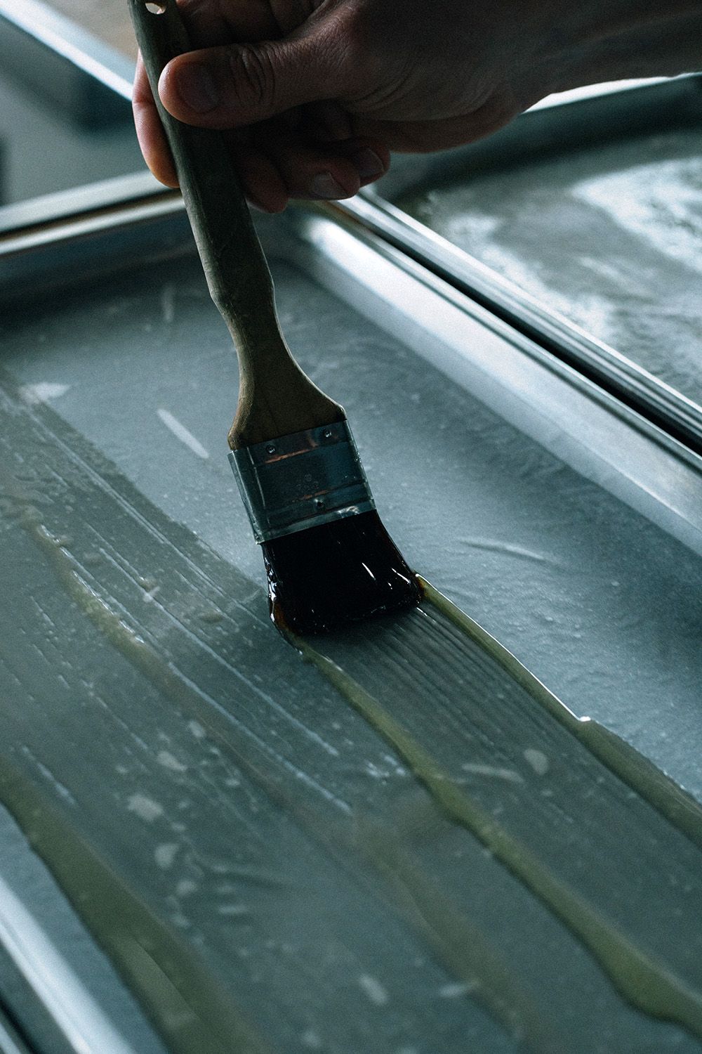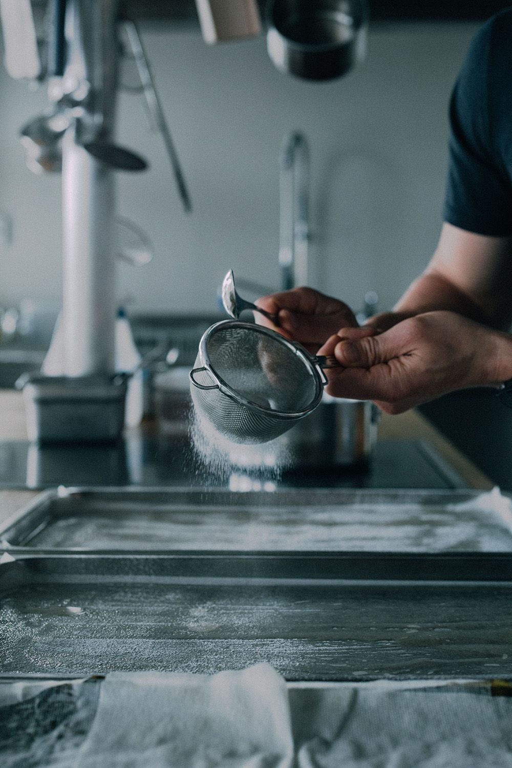 Pre-heat oven to 175 degrees on 50% humidity. Line a baking tray with parchment paper and brush generously with melted clarified butter. Give the entire tray a light dusting of powdered sugar over the clarified butter, then lay the seaweed down as flat as possible. Brush the seaweed with clarified butter and dust with a generous amount of powdered sugar. Place baking trays into the oven and bake for 5 minutes.