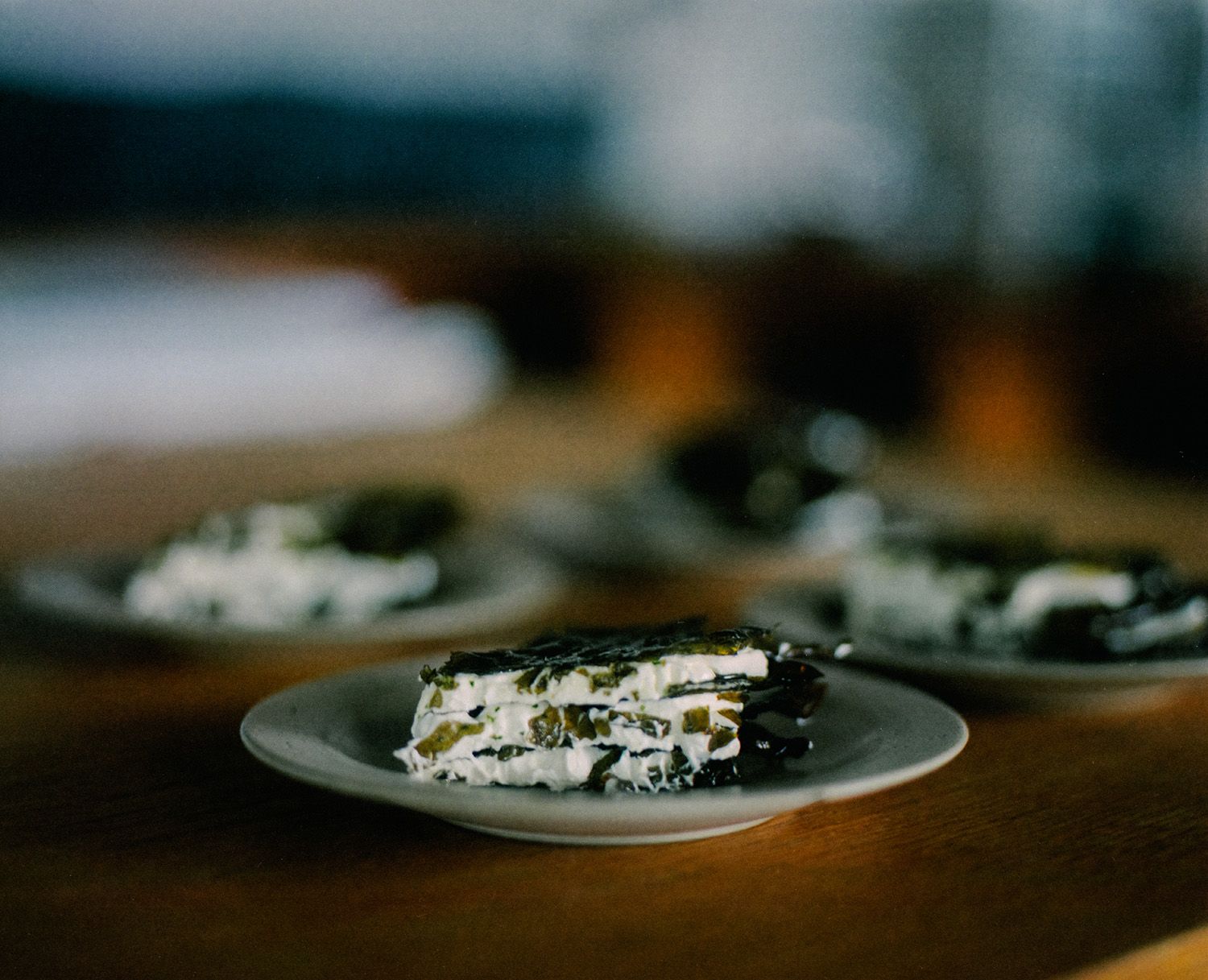 Note: There are a few changes in the version of Seaweed Mille-Feuille for Appetite, to make the recipe more home accessible: instead of the honey kombucha and pine needle dashi poaching liquid used in the restaurant, the hirome seaweed is cooked in spiced dashi, cassis-infused oil is replaced with a nut oil, and salt is recommended for plating rather than pine salt.