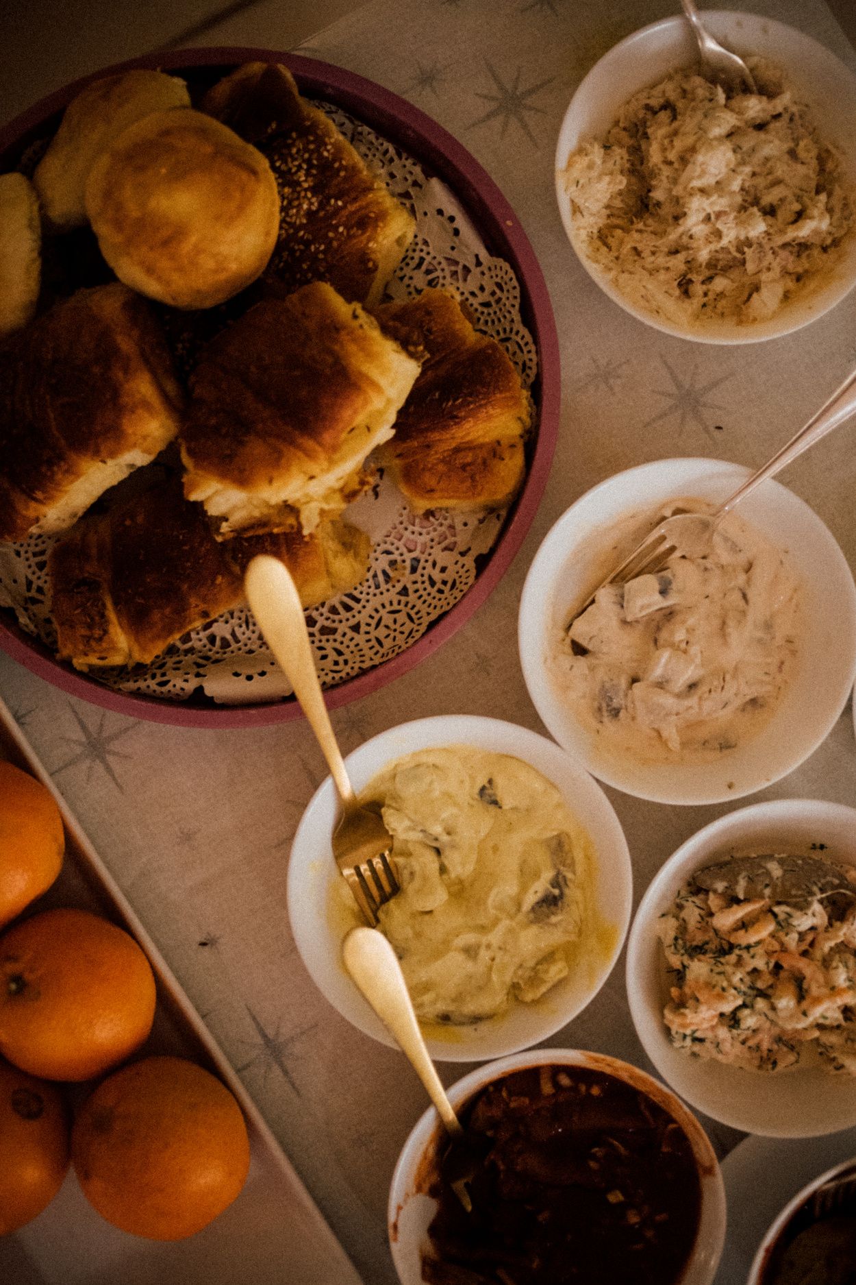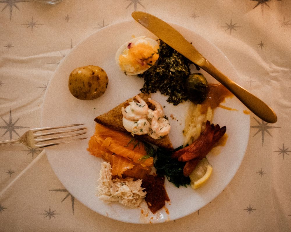 Swedish Julbord – literally, ‘Christmas table’ – is divided into three parts. The first plate is usually fish – often pickled herring or gravadlax. Second, come cold cuts – including smoked Christmas ham – along with prinskorv (cocktail sausages). Warm mains enter with the third course, dishes such as meatballs and a potato and anchovy casserole called Janssons frestelse. Sweet breads like saffron bread and kanellängd (cinnamon bread) are also a Christmas season staple, coming in an array of shapes and fillings; they’re eaten both alongside meals and any place fitting after a bakery visit.